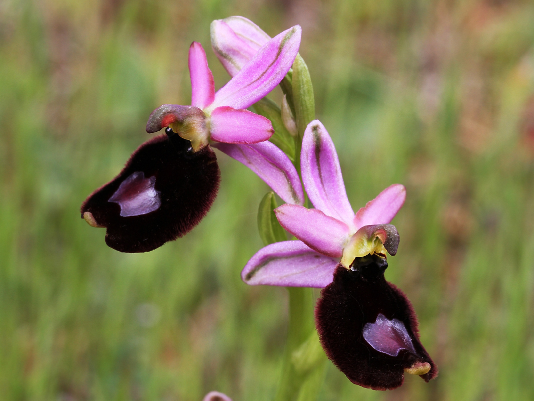 Description - Plante robuste, haute de 15 à 25 cm. 3 à 6 grandes fleurs à périanthe rose vif, avec pétales plus foncés, de longueur égale aux 2/3 des sépales. Labelle entier, long de 14 mm en moyenne, un peu à nettement cambré, brun noirâtre, orné d'une macule bleue à violacée, plus proche de l'extrémité. Appendice moyen, inséré dans une échancrure.