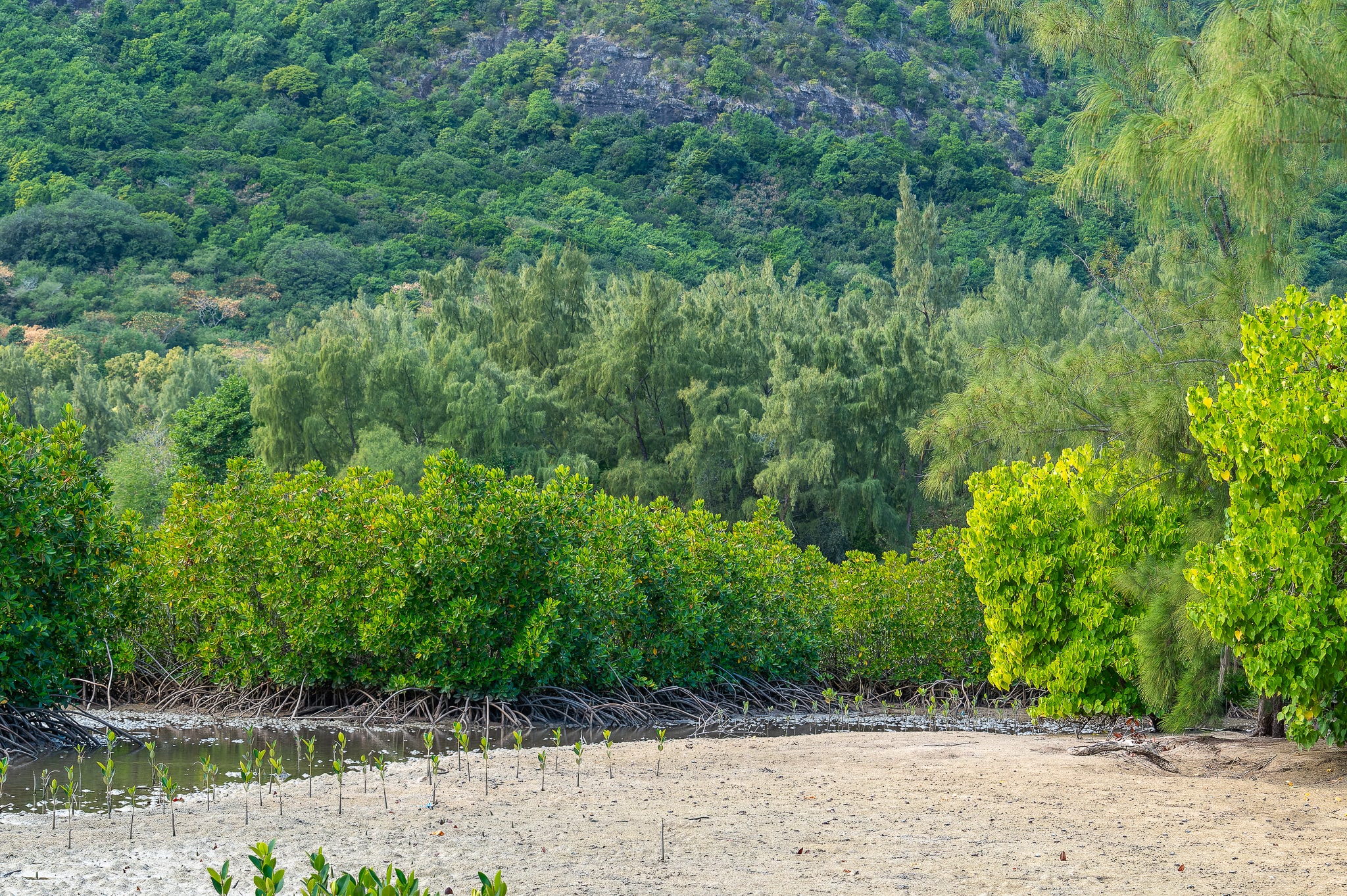 La Morne vers la pointe Ouest de l'Île - Mangrove avec une plantation de palétuviers pour sa reconstitution